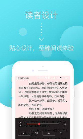 【海量书籍】涵盖悬疑灵异、豪门总裁、现代言情、青春校园、耽美同人、科幻末世、武侠仙侠等众多热门小说汇聚于此,更多书籍供你选择。【读者设计】自由调节字号、快速简易的翻页、亮度调节、背景颜色选择、日夜模式切换等贴心设计,只为至臻阅读体验。