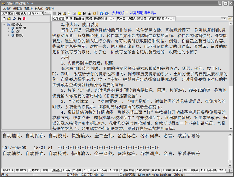 作为一个爱好看书的程序员,有感于作者码字的辛苦,特别开发本软件,本软件承诺终身免费使用,免费升级。写作大师是一款绿色智能辅助写作软件,软件无需安装,直接运行即可,你可以复制到U盘等移动设备上随身携带使用。软件本身并不能为你提供直接的写作,软件能为你提供的,是智能辅助,通过对你的输入进行分析,你可以实时获取到各种词语、例句、你自己之前写过的内容、收藏的信息等提示。这样一来,你无需查询词典,也不用记忆庞大的词语库、素材库,写过的就是你下次再写的素材,有了它,你就再也不会忘记以前写过的、收藏过的东西了。 自动辅助、自动保存、自动校对、快捷输入、全书查找、备注标注、各种词典、名言、歇后语等等,目前我们能想到的都开发上去了,如果大家反响不错的话,后续我们会继续改进,争取给广大文字工作者减轻码子的辛苦!【更新日志】