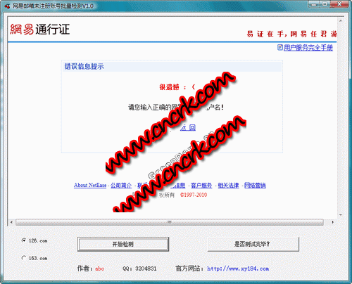 本程序用于批量检测网易邮箱未注册账号 程序特性:自动输入用户名,生日。