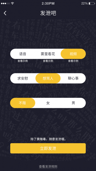 【下单】进入主页面,点击“我要发泄”下单。下单前有三种模式(语音、雾里看花、高清视频)、三种需求(求安慰、想骂人、聊心事)可供选择,对发泄对象亦可以选择性别。