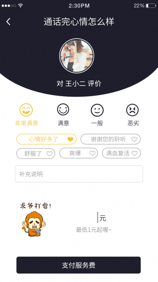 发单者发泄完毕之后,需要打赏至少1元的服务费(推广期间);发单者中断服务,依然需要支付服务费,请求加时1分钟,需额外支付0.5元。