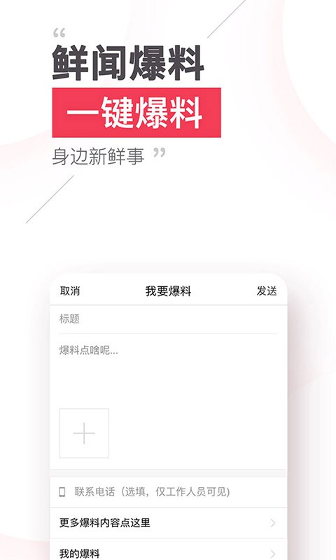 随时随地上传新闻事件的照片和文字,一键爆料身边新鲜事,百人爆料团等你来加入,更有红包等你领取。
