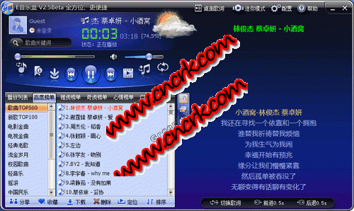 E音乐盒是一款融合多款强大MP3搜索引擎、视频搜索引擎、歌词搜索引擎的音乐盒,可以看MTV的音乐盒,只需关键词就可以播放歌曲、专辑、歌手音乐全集、关键词相关所有歌曲的音乐盒
