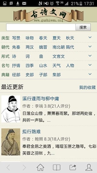 古诗文网作为传承经典的网站成立于2011年。古诗文网手机版app专注于古诗文服务,致力于让古诗文爱好者更便捷地发表及获取古诗文相关资料。古诗文主要指中国古代的诗歌和散文,拥有着悠久的历史文化内涵,如《诗经》、《史记》就是其中流传的比较优秀的作品。