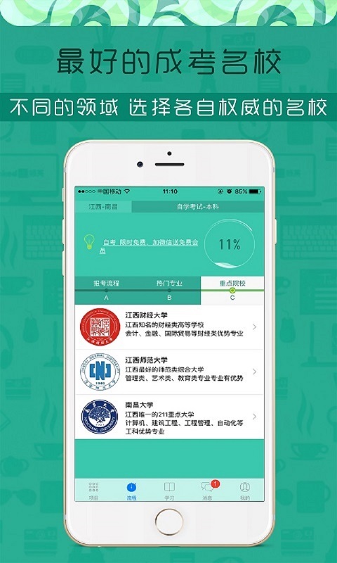 提供自考全程免费流程指引,覆盖报名、审核、报考、缴费、考试、查询成绩、论文答辩和领取毕业证等共20多个步骤,提供时间提醒、地址定位、真实官网、资料准备、办事程序等。伴我考自学考试还专门为您推荐重点院校及热门专业,并根据课程考试计划来引导你的学习和考试。从择校到毕业一站式解决,助您早日获取毕业证!【更新日志】