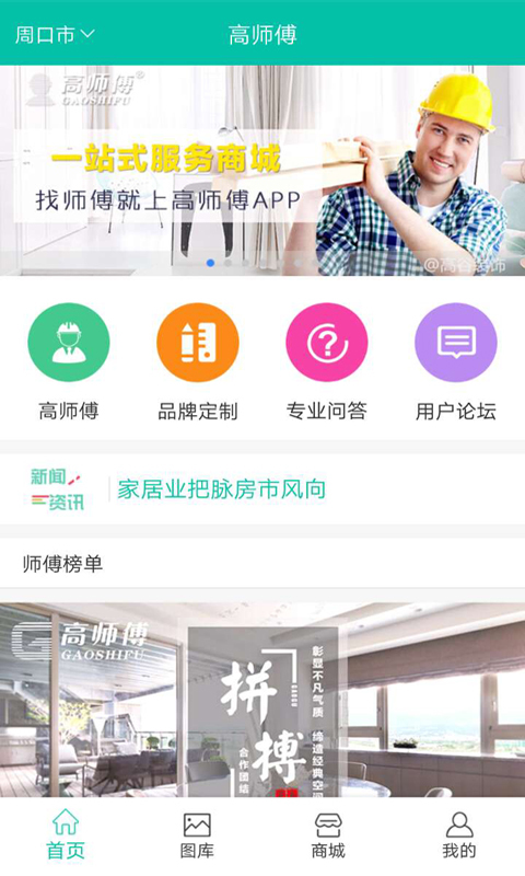 高师傅是一个以工人师傅为基础,涵盖装饰行业商城、售后服务及家装设计图为一体化的平台。