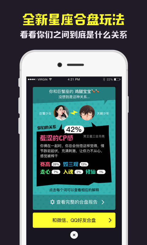 在这个虚拟世界里,隐藏着命中注定的缘分。电波通过通过星座匹配,在浩瀚宇宙中,找到有趣的朋友。