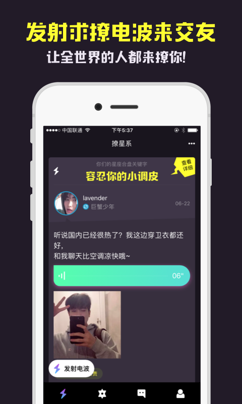 在撩星系发送“电波”,配上声音和图片,电波将在24小时之内为你匹配