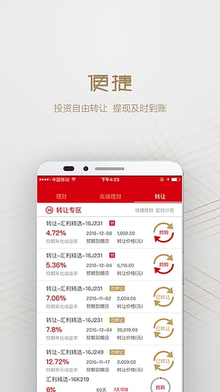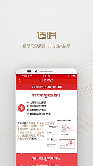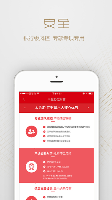 太合汇·汇财富是由深发展原行长、平安银行原董事长领衔的太合汇资本倾力打造的互联网金融资产交易服务平台,专门为白领、中产精英等高潜力人群提供安全、透明、专业、可信赖的财富管理和理财服务,实现财富增值。平台严选交易对手,其中包括世界500强企业、信用评级AA+及以上企业和精选优质上市公司。汇财富是太合汇资本旗下理财品牌,为广大投资人提供一站式综合理财平台服务。【软件特点】