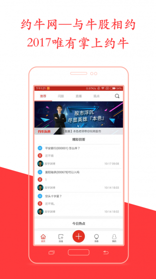 约牛网是证监会认可的投顾服务公司,是国内新兴的股民投资服务平台。2017年约牛网正式推出约牛炒股手机客户端,为股民提供更加便捷的服务:【股市直播】投资高手在线直播股市行情,百分百看盘好助手,提供业内最全最专业的直播服务。