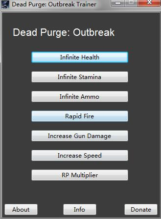 死亡净化爆发七项修改器是一款射击竞技类游戏“死亡净化爆发”的游戏辅助工具,死亡净化爆发修改器具备无限生命、体力、弹药、快速燃烧、枪伤增加和加快速度这七项修改器功能,能够帮助玩家更好的通关游戏,合理使用让游戏更精彩。