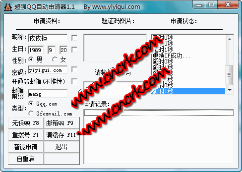 本软件采用全自动POst自动提交方法,主要针对QQ申请,全自动宽带连接,Cookies清理等,做到了10秒申请一个QQ,相当于是秒杀QQ哦,非常方便 是QQ一族的最爱哦!