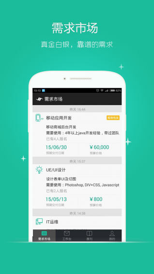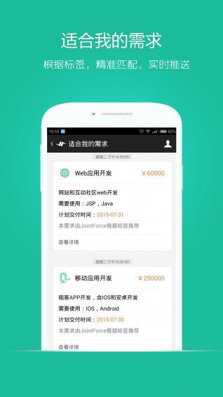 主要面向什么用户?主要面向JointForce平台的发包者和接包者。 JointForce会将最新的需求以及通过发包者的简历、标签等精准匹配的需求推送到移动端,接包者可通过需求市场或者“适合我的需求”浏览需求,快速接包;发包者和接包者可以针对投放的需求进行定向沟通。 除需求外,JointForce平台还会将JF平台的资源动态、订单执行过程的重要节点(比如,签单、提请验收、付款等)推送到移动端,发包者以及接包者可在移动端随时随地完成相关工作。 JointForce移动端后续还会根据用户的反馈,补充更多有用的功能。