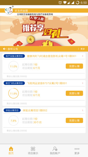 好友邦金服APP是一款P2F2B互联网金融平台。全球航空金融互联网交易平台,灵活安全高息收益远超银行基金股票,打造航空业与融资租赁领域理财第一品牌。