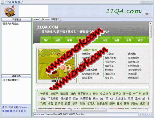 21QA游戏盒子-绿色版,使用此软件可以浏览、收集、下载上万个小游戏,游戏下载到本地后,即使不能上网时,游戏也可以轻松玩,应广大用户的要求,此版本新增一个功能,使用Ctrl + Alt + h可以快速隐藏以及显示软件主窗体。