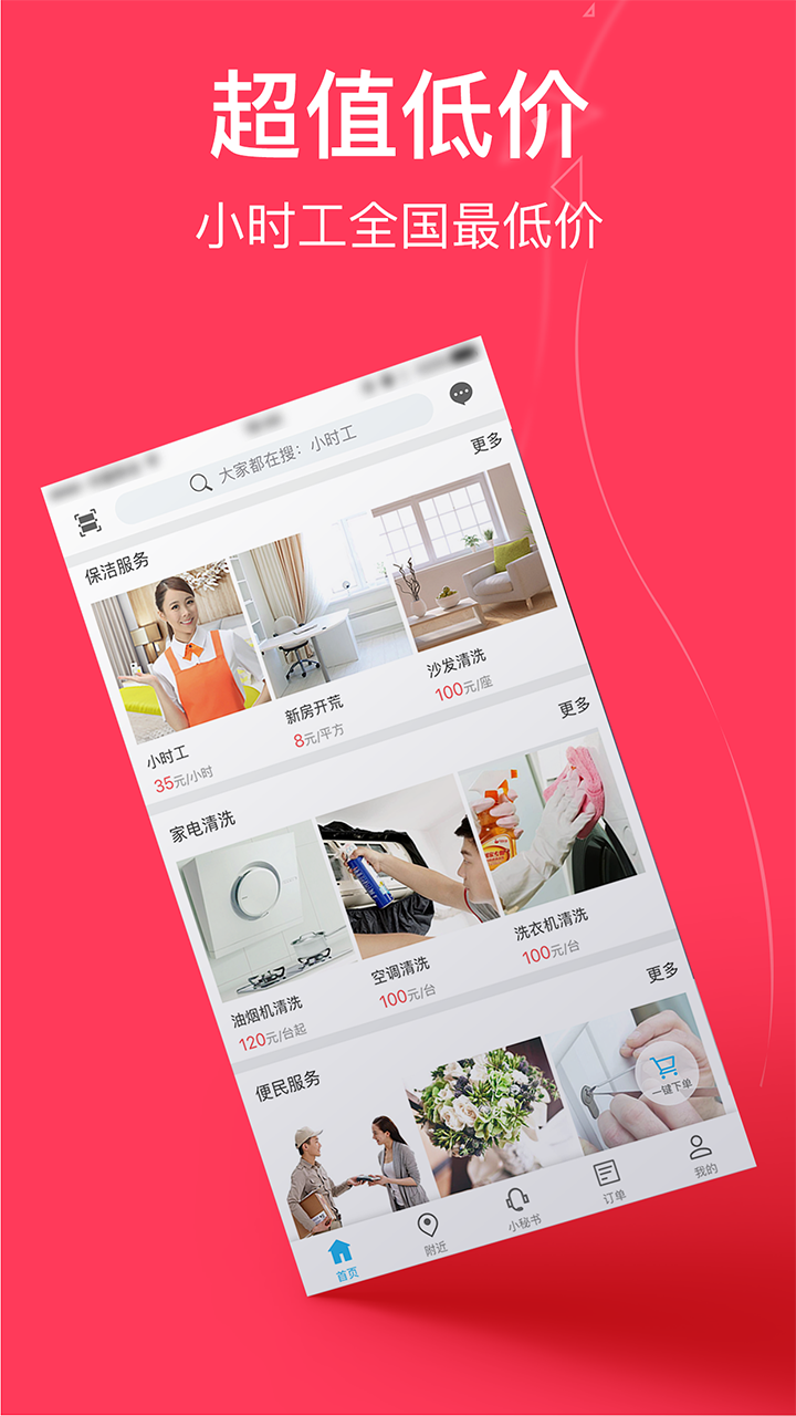 【家政】保洁/保姆/看护/家电清洗/沙发保养/地毯清洗/洗衣,随时随地帮您解决生活杂务问题。【维修】电脑维修/家具维修/水电维修/墙面维修/鞋包维修/管道疏通等,工人和服务商都是经过健康审核、实名认证和工作资历等多重审核才为您服务。
