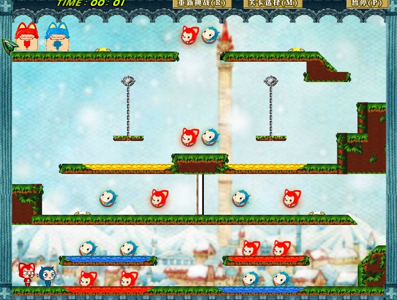 小狐狸阿狸可爱的形象深入人心,在游戏《阿狸勇闯冰火岛》中可爱的阿狸带着它的朋友一起来到冰火岛冒险啦。本作品支持两人一起游戏,在游戏中玩家控制阿狸在冰火岛展开冒险,注意冰火岛充满了危险,千万要小心哦,而且有些关卡需要两人齐心协力才能过去。快和你的小伙伴一起来试试吧。【游戏特色】