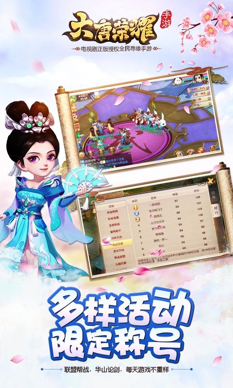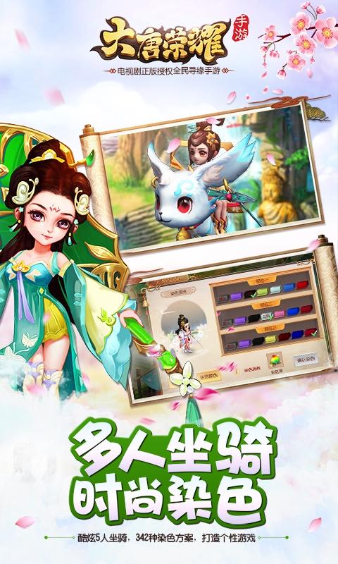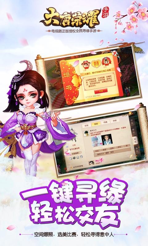 《大唐荣耀》电视剧正版授权手游,精心还原电视剧情和场景道具,更有超多隐藏情节等待挖掘,体验精彩的大唐世界。作为一款寻缘的Q版回合手游,《大唐荣耀》搭配LBS真实定位系统,与咫尺的ta浪漫相约。创新战斗示爱功能,对心仪之人热情告白,携手私奔。游戏还为玩家准备了唯美的盛唐婚礼,情侣坐骑、互动动作、情侣时装、情侣家园等等。让世界见证你们的爱。2017甜蜜寻缘回合手游,《大唐荣耀》等你来寻缘!【游戏特色】