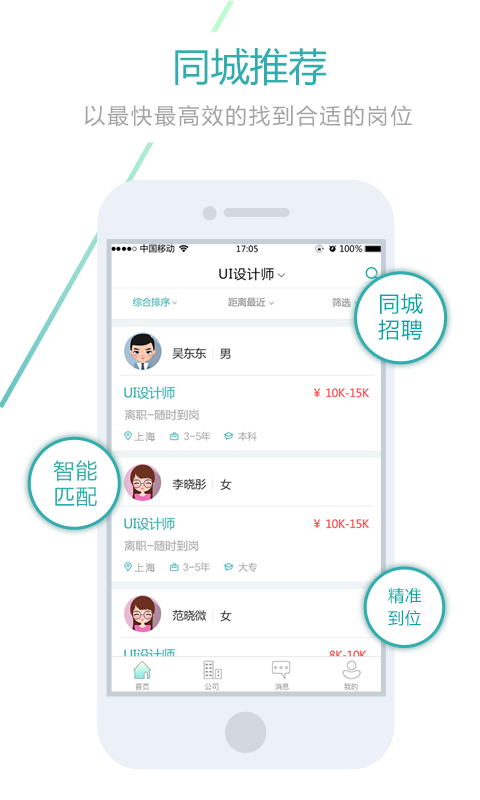 1. 首页,展示根据用户的意向推荐的工作机会,并提供多项筛选和搜索功能。2. 公司,展示了上海本地应聘者热衷的公司,并展示公司的状况和招聘的全部职位