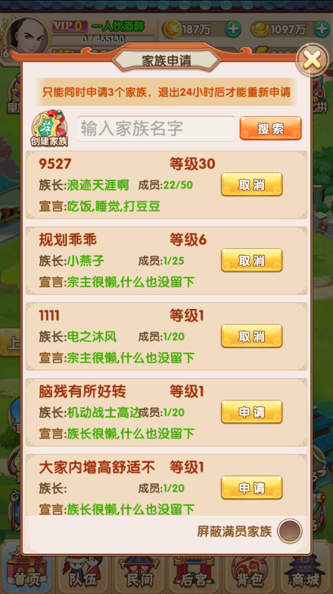 7.家族加入:到达一定等级之后,家族系统可以开启,记住一定要加入哦,并且要每天增加自己在家族中的活跃度,不然会被踢掉的!(温馨提示:每天最多只可以申请三次加入,一但被拒绝,就得等到第二天才可以申请了)