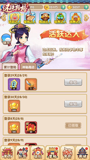 累积游戏登陆天数便可解锁活跃成就,玩家不仅可以获得大量元宝还能获得橙色装备和神品人物碎片,在游戏初期便能将战斗力爆表的尔康加入队伍提高战力,是不是想想就觉得很赞呢?另外在坊市中刷新达到一定次数便能领取神秘刷新令,有了刷新令就能轻而易举挑选到自己需要的物件。