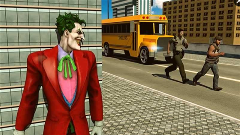 小丑Joker带你走进惊险刺激的犯罪世界,高清3D游戏世界,自由的犯罪之旅在街角隐藏自己的身影,偷袭路过的警察,在城市中制造恐怖袭击,袭击校车,攻击前来救援的警察,