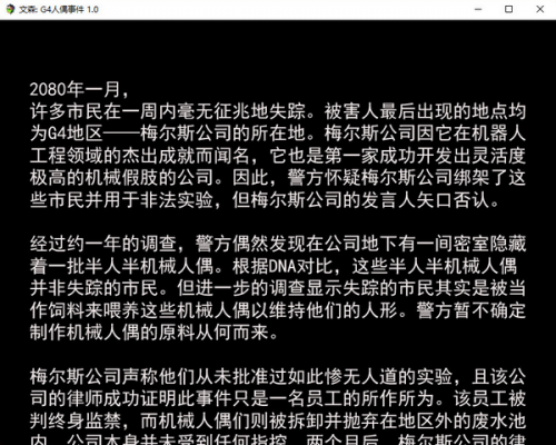 文森G4人偶事件是一款带有点悬疑色彩的解谜类游戏。玩家在游戏中将成为一名神秘的调查员,调查位于G4地区的梅尔斯公司人口失踪事件,解开这个难解之谜。