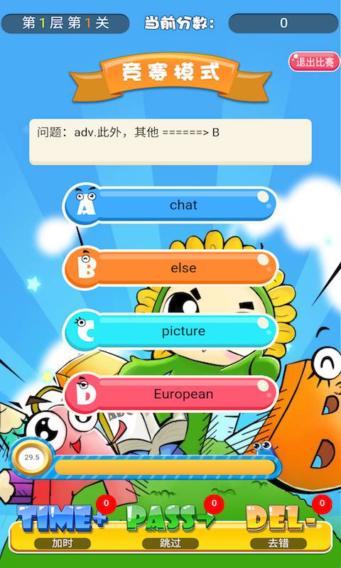 比赛场答题时可使用道具,分别为加时、跳过、去错、复活。