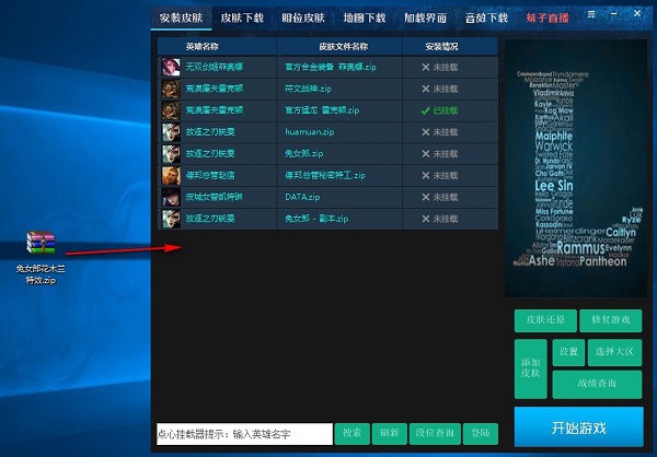 3.打开点心挂载器,第一步用左键将皮肤文件拖动到挂载器内(如下图),第二步右键皮肤文件,选择“安装皮肤”,然后“启动游戏”,进入游戏就可以看见刚刚更换的皮肤了。