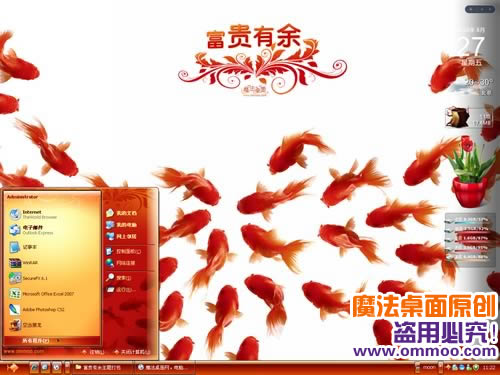 鱼,为人们所喜爱,除了它的食用价值外,还由于它是一种美好的文化象征。魔法桌面原创富贵有余电脑桌面主题,大红色渲染了整幅画面,营造出富丽富贵之感。