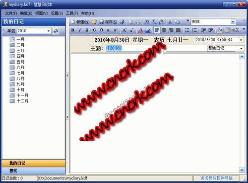 慧慧日记本 V1.1 简体中文绿色免费版 慧慧日记本是一款简洁易用的电子日记本。它在传统日记本以天天记录笔 记的开发原则上,再实现了日记的打印、加密(保护个人隐私)等功能,软件 同时支持多种格式的快速导入和导出操作。 慧慧日记本是以日期为排列顺序的笔记,既方便查看也方便用户进行科学 管理,再加上软件本身专属的搜索功能,可以快速准确的找到想要的内容。另 外,日记还增加了多功能编辑器,可以随心所欲,图文并茂的记录生活、工作 、情感上的点点滴滴,拥有慧慧日记本使您的日记不再只有单一的笔墨表达