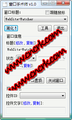 窗口手术师 V1.0 简体中文绿色免费版 窗口手术师是一款小巧的控制窗口的好工具.它不但可以轻松复制窗口的文字、标题,还能获取窗口内控件的文本.除了简单的查看功能,它还可以对窗口进行完全的修改——修改标题、改变透明度、改变窗口状态(隐藏、显示等等)、将窗口置顶、修改窗口内控件的文字……总之,在窗口手术师的刀下,你可以随心所欲地控制窗口