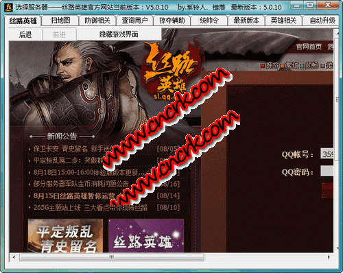 系铃丝路英雄辅助工具 V5.0.46 简体中文绿色版 系铃丝路英雄辅助工具是丝路英雄游戏的辅助工具。软件的主要功能有自动冒险,自动寻找死城坐标插旗,扫描军队数量,财富,免费休整,防御监控,包括发送信息到您的手机,自动修炼,查询用户QQ以及QQ查询用户游戏名称,自动升级建筑等多个功能,并且完全免费。
