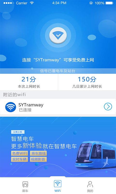 1.WiFi:下载智慧电车APP,用户可在浑南电车站台及车厢内享受上网服务;2.乘车:为乘客提供电车线路查询、站点信息查询、实时车辆位置查询、乘客诉求等乘车服务以及视频影音等娱乐服务,满足乘客的多方位需求;