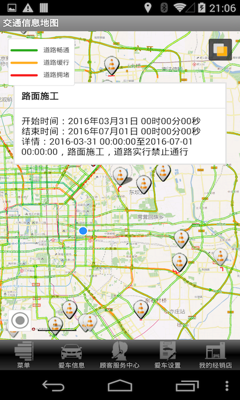 3、路况信息:查看当前道路拥堵情况、通行情况、一般交通事件、城市限行信息。根据预测路况推荐路线,预测到达时间并设置定时提醒。