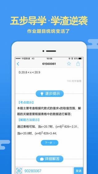 一、导学号搜题:按键或语音输入导学号,不会做的题目统统变活题。1、逐步提示:一步一步给出解题思路,引导学生独立解决作业难题。