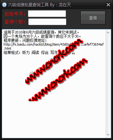 适用于2010年6月六级成绩查询,其它未测试。 因一个考场为30个人,故查询个数应不大于30。