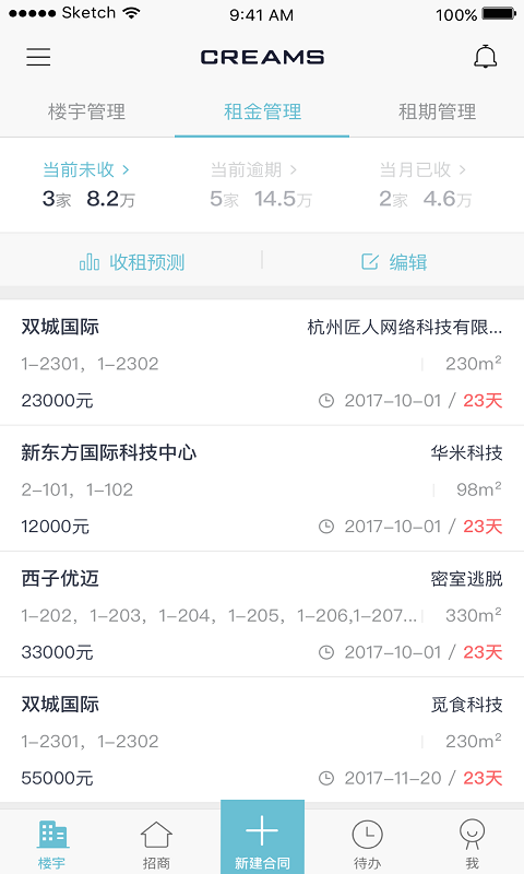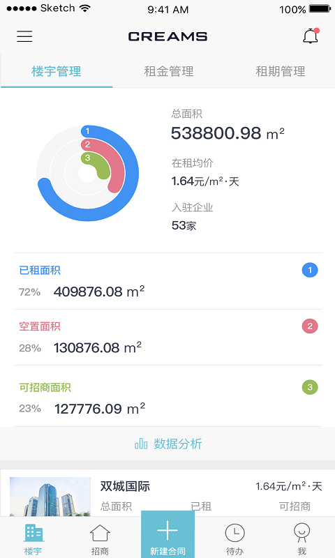 CREAMS依托强大的客户数据分析功能,利于业主端轻松掌握楼宇租况,实时监测合同租期,帮助招商工作前置,降低楼宇空置率及空置期,高效解决招商慢、管理乱、收租难等问题。CREAMS是匠人科技为了迎合科技时代智能管楼的愿景,利用互联网技术,打造的楼宇管理超级工具。