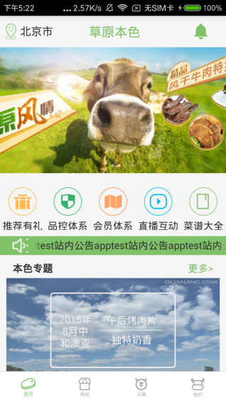 此APP是一个以商城为主题的软件,草原动力(北京)股份有限公司在澳大利亚的全资子公司“Australian Prime Meat Co. Pty Ltd”主要从事“和牛”“安格斯”肉牛的饲养及肉羊的饲养管理,为公司的主要战略“牛(羊)在澳洲养,肉给国人吃”“吃安格斯牛肉。在此商城里我们可以购买安格斯牛肉。