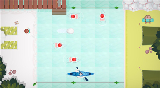 从《泳池逃生》的规则设定来看,它是基于“你来我往”式的回合制玩法。玩家在游泳池里每游动一格,同一空间内的诸如皮划艇、水生物(螃蟹、水母)等也会移动一格。