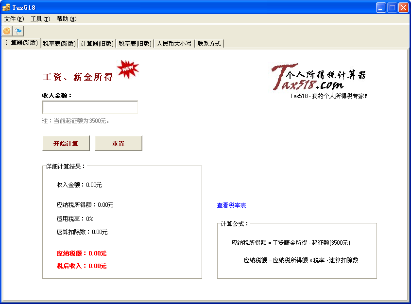 Tax518个税计算器下载 1.0 绿色版 Tax518个税计算器是一款简单实用用的个税计算器。只需打开软件输入自己的月收入就可以马上算出答案。内置税率表,一目了然。有需要计算个人所得税的网友可以下载使用。