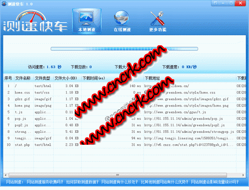 “测速快车”是“51测速网”推出的一款针对网站页面访问详情的分析工具,详细统计页面打开 过程中下载的所有文件的信息,分析对比文件下载时间、文件大小、下载速度等,找出影响网站访问速 度的原因;本软件是帮助用户优化网站内容结构,提高用户访问体验,是网站开发人员,个人站长,网 站管理人员等的必备工具。