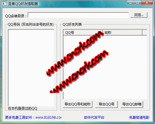 圣者QQ好友提取器,可以提取本机所有登录过的QQ的好友列表,并可以导出好友列表,导出好友QQ邮箱等。此工具软件配合QQ项目做网赚,如虎添翼。导出QQ和昵称时,格式为 (QQ号码----昵称)。