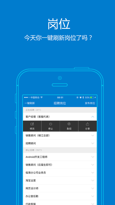 实时管理岗位:随时发布职位、刷新职位、急招,还能分享职位到朋友圈