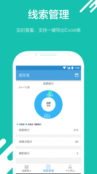 4.线索人性化管理,支持按地推点、日期、兼职管理,支持一键导出Excel表,更可以无缝对接到中心CRM;