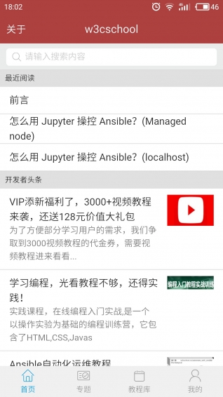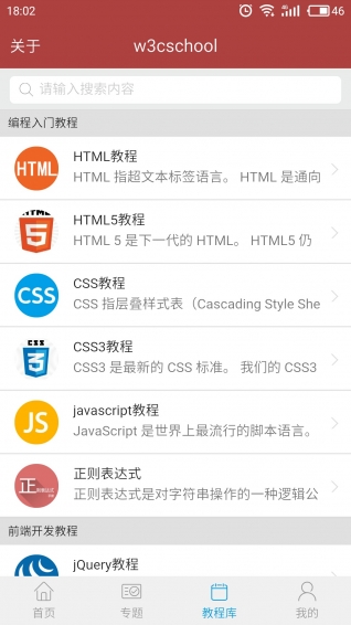 w3cschool app最上方配有搜索引擎功能,只要输入相对应的教程,就会刷出相关系列的教程。