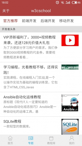 W3Cschool APP是W3Cschool官方正式版手机客户端。我们是一个专业的编程入门学习及技术文档查询应用,提供包括HTML,CSS,Javascript,jQuery,C,PHP,Java,Python,Sql,Mysql等编程语言和开源技术的在线教程及使用手册,是类国外w3schools的W3C学习社区及菜鸟编程平台。方便的查询各种技术手册如:HTML参考手册、CSS参考手册、JS参考手册等等。