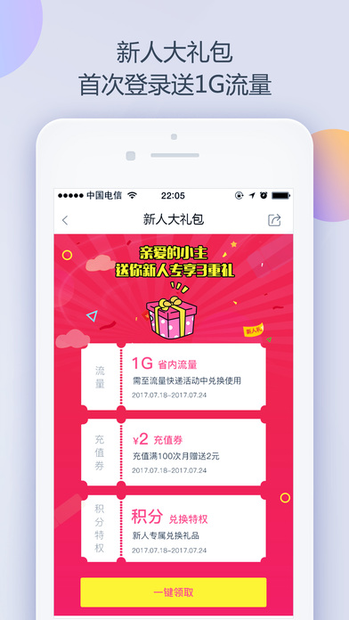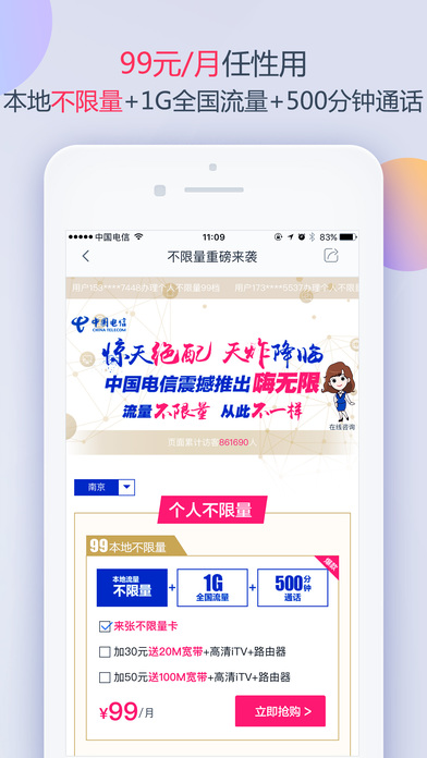 1、全新推出流量不限量套餐,最低99元2、增加新人大礼包,新用户送1G流量