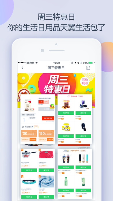 3、电信业务优惠活动:充值享优惠,流量半价抢、老用户优惠购机、天翼大家庭、签到领积分..... 精彩纷呈!