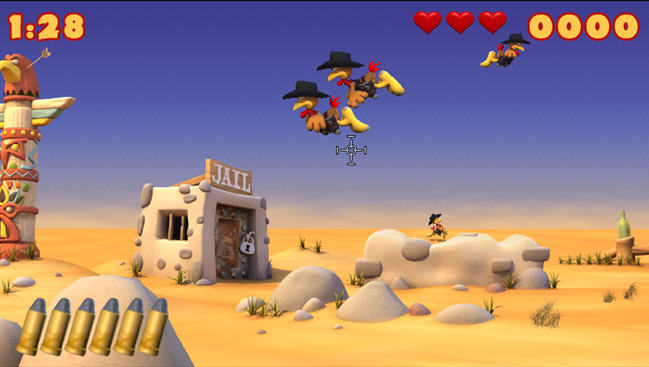 画 面:怪鸡系列的新作在画面上更加精美丰富,2D的卡通动画显得十分真实。各种有趣角色和西部小镇的风貌被描绘的栩栩如生。声 音:激昂的西部风格音乐将带领你进入这个奇妙的西部小镇,真实的枪弹射击声和各种角色发出的声音即紧张也充满了趣味。